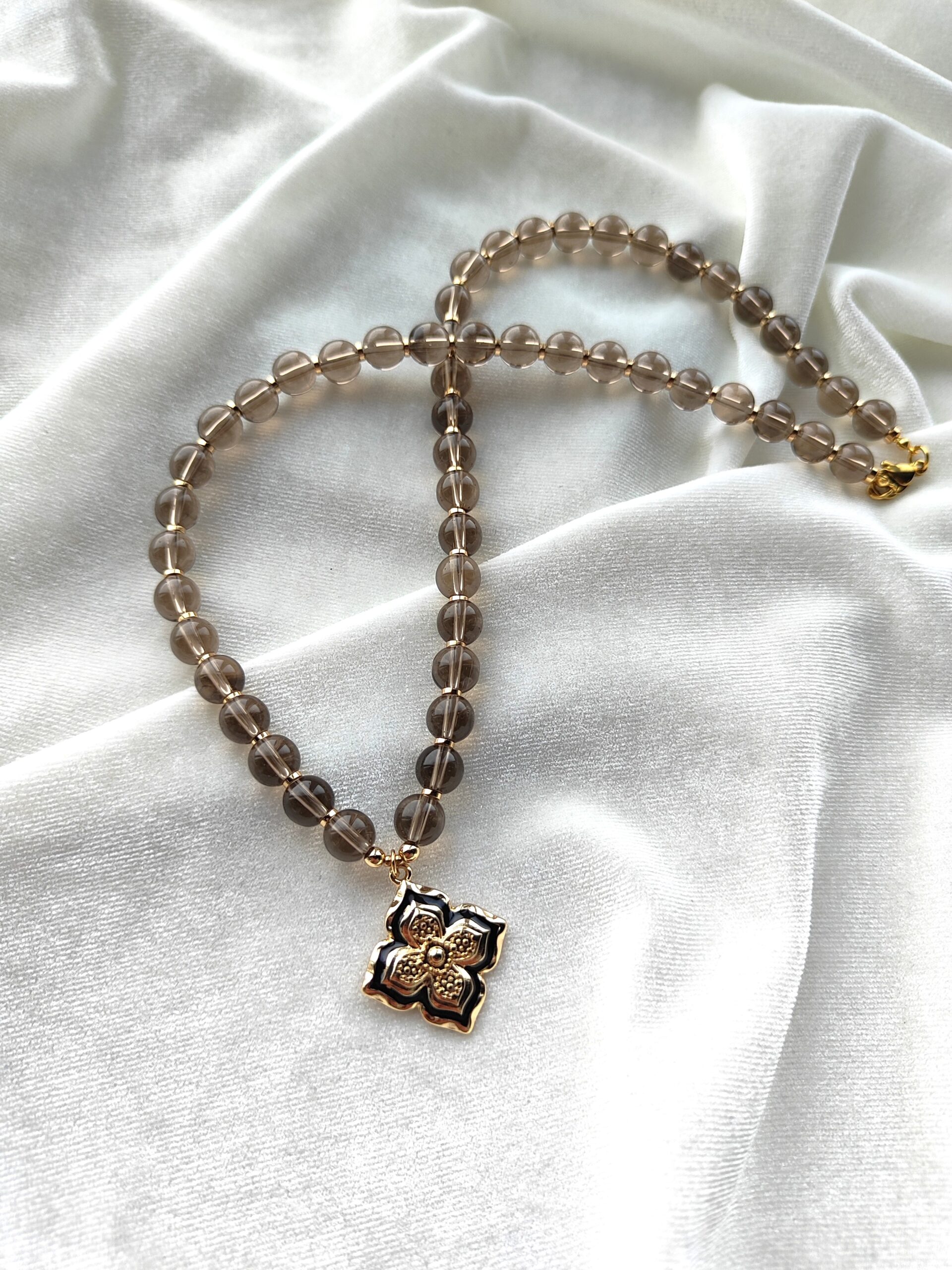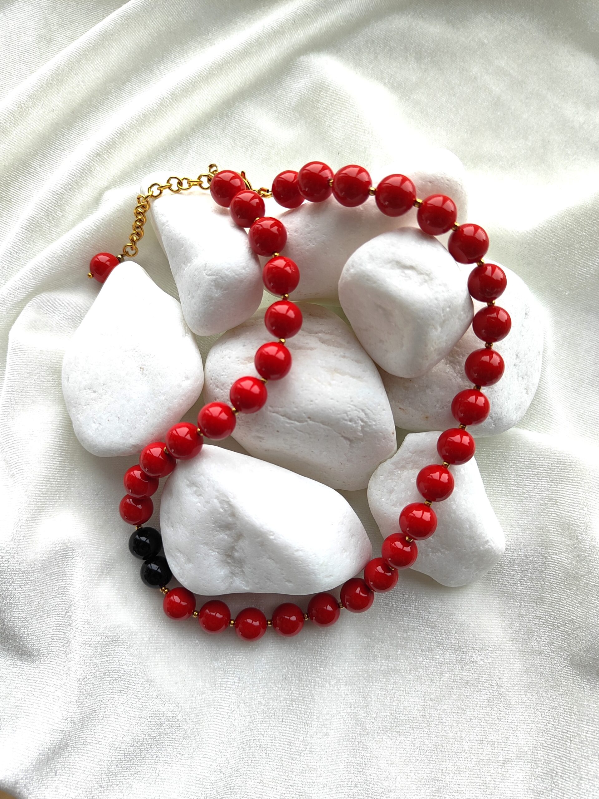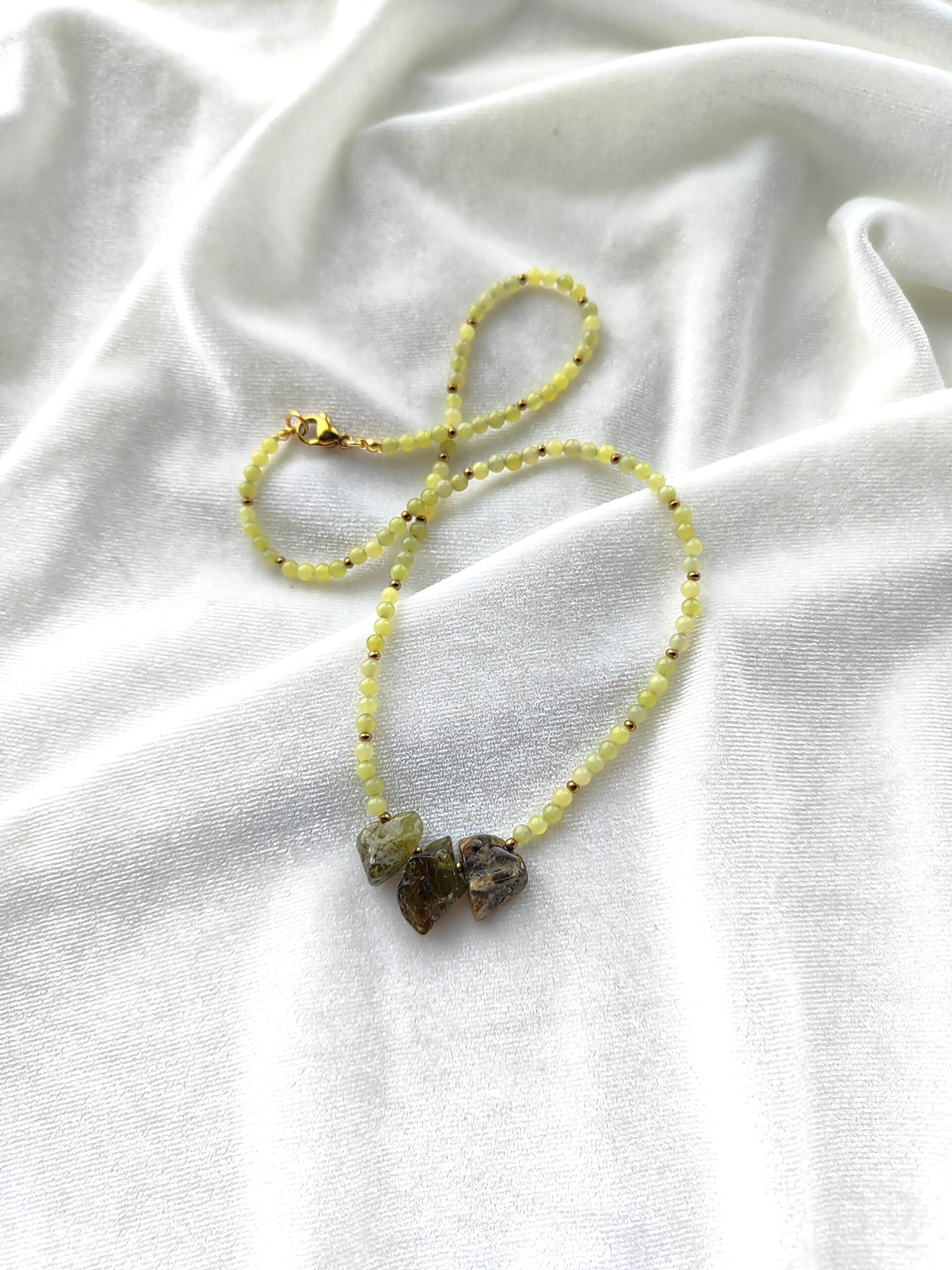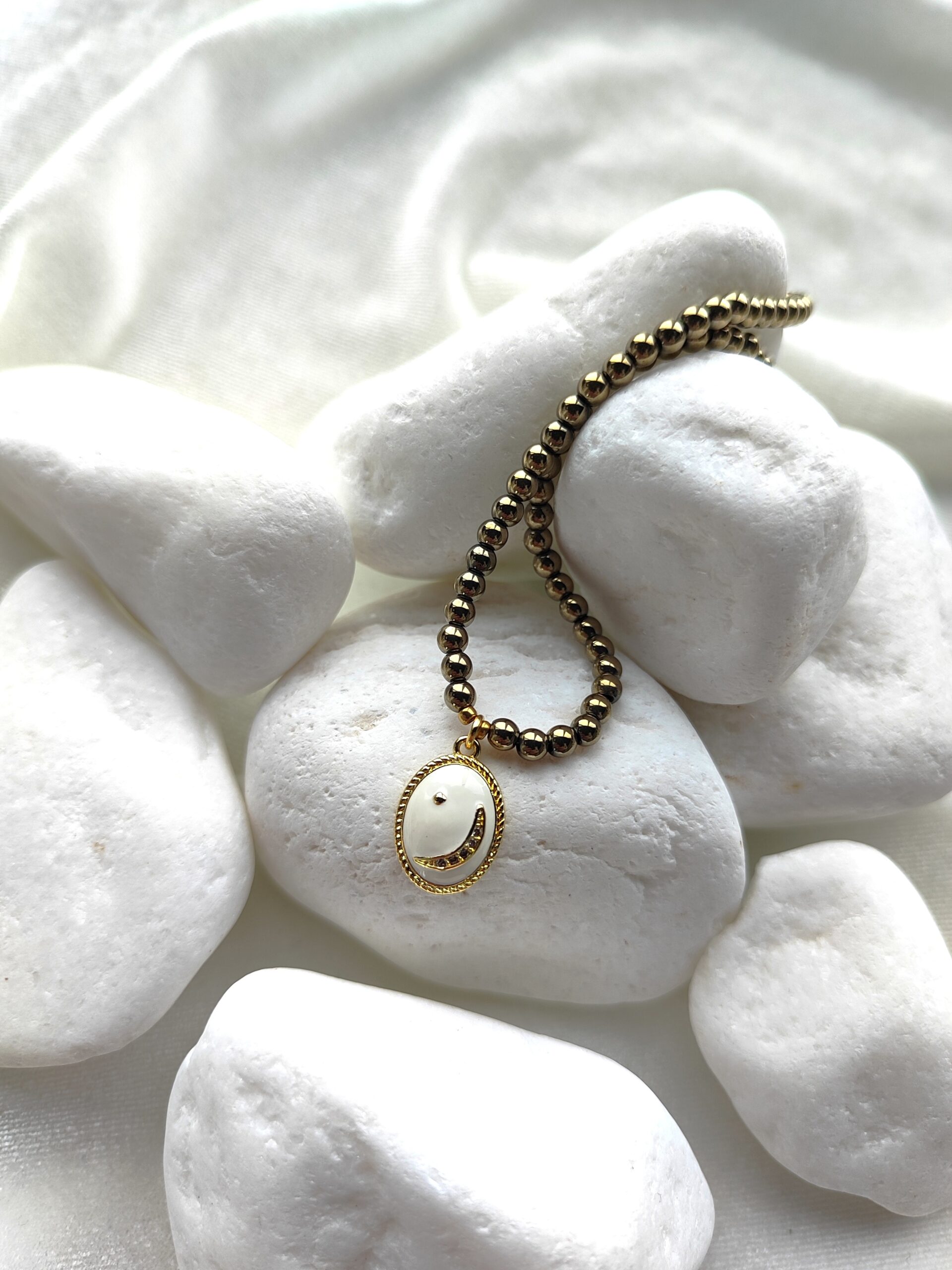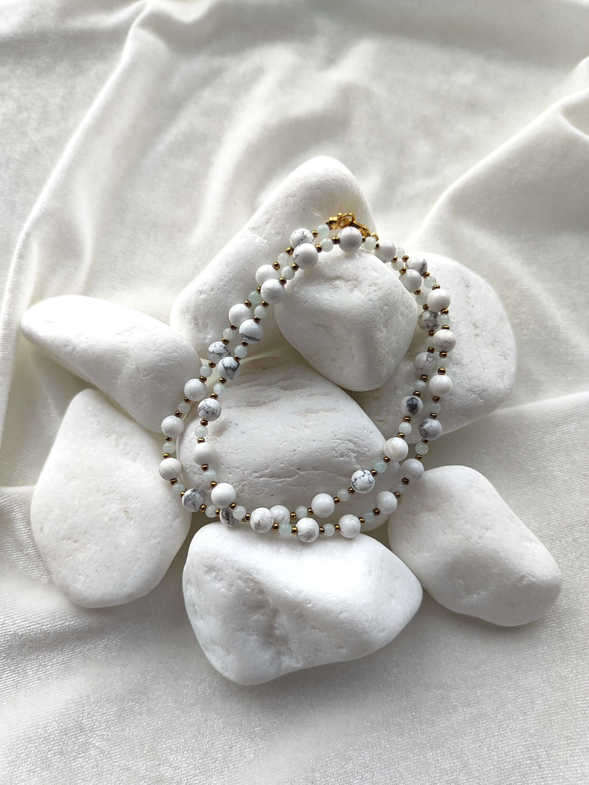 Trijų eilių įvairių akmenukų apyrankė su natūralia oda ir metalo spalvos detalėmis. Apyrankė suverta ant aukštos kokybės nerūdijančio plieno troselio. Apyrankė tinka 17cm riešui.
